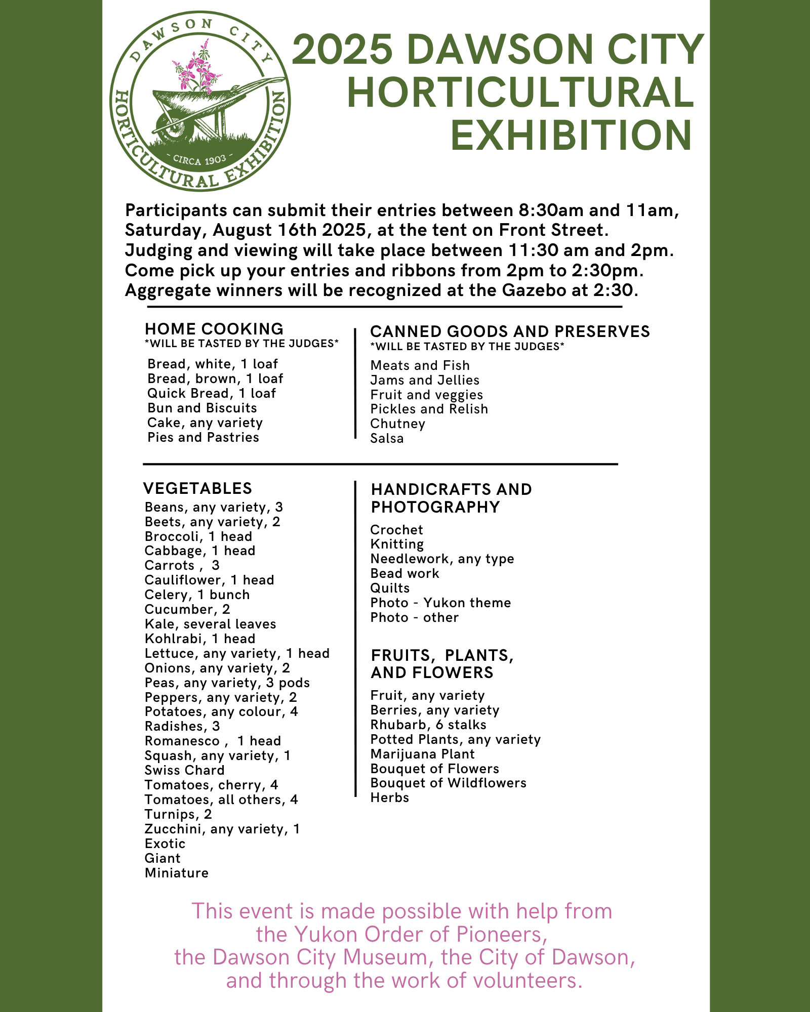 The Horticultural Exhibition is the place to see the delicious and impressive stuff that gets grown or made right here in Dawson City! Held on Discovery Days weekend, the Horticultural Exhibition shows off the best that Dawson’s green-thumbs have to offer. Categories expand to more than just gardens too. They include veggies, berries, flowers, baking, preserves, quilting, beading, and photography.